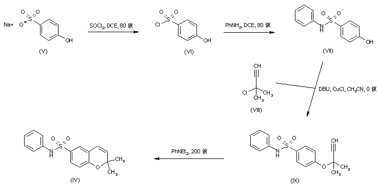 In a different method, sodium 4-hydroxybenzenesulfonate (V) was converted to the sulfonyl chloride (VI) upon treatment with thionyl chloride in hot 1,2-dichloroethane. Reaction of acid chloride (VI) with aniline provided sulfonamide (VII). Alkylation of the phenolic hydroxyl group of (VII) with 3-chloro-3-methyl-1-butyne (VIII) in the presence of DBU and CuCl gave the propargyl ether (IX), which was then cyclized to benzopyran (IV) under Claisen rearrangement conditions.