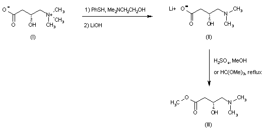 Intermediate hydroxyester (III) has been obtained as follows: Demethylation of (R)-carnitine (I) by thiophenol in dimethylaminoethanol, followed by precipitation with LiOH, gave lithium carboxylate (II), which was esterified to (III) by treatment either with H2SO4 in MeOH or with trimethyl orthoformate in refluxing methanol.
