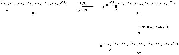 The condensation of palmitoyl chloride (IV) with diazomethane produced diazoketone (V). This was then treated with HBr to yield bromoketone (VI).