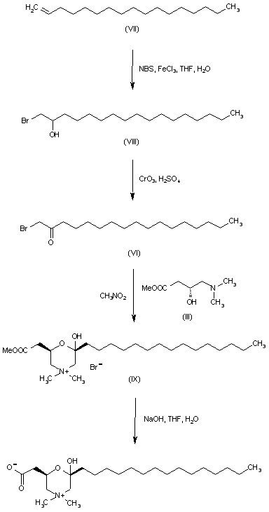 In a different procedure, treatment of olefin (VII) with N-bromosuccinimide produced bromohydrin (VIII), which was further oxidized to bromoketone (VI) by means of Jones reagent. Condensation of bromoketone (VI) with aminoalcohol (III) in nitromethane furnished the morpholine derivative (IX). The ester group was finally hydrolyzed with to yield the title compound.