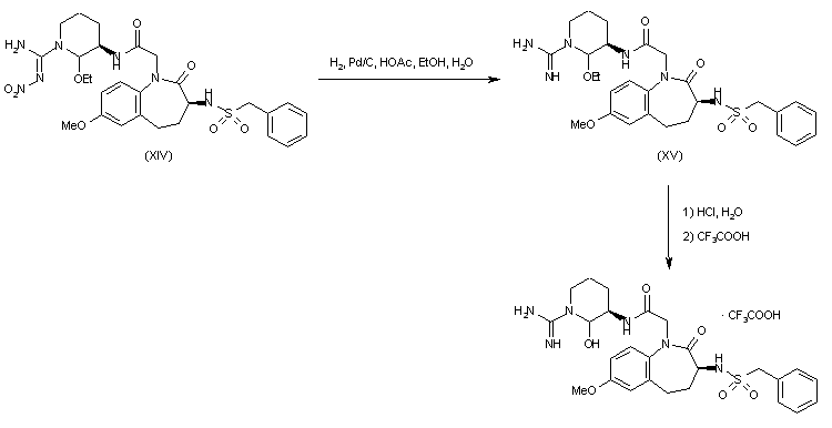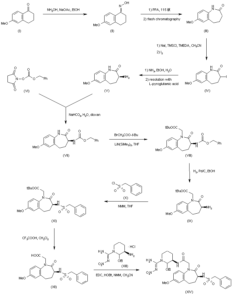 6-Methoxy-alpha-tetralone (I) was converted to the corresponding oxime (II) by treatment with hydroxylamine in the presence of sodium acetate. Subsequent Beckmann rearrangement of (II) employing polyphosphoric acid produced a mixture of two regioisomeric lactams from which the required 1-benzazepine (III) was isolated by flash chromatography. Iodination of (III) to give (IV) was carried out following a previously described metodolgy. Displacement of the iodolactam (IV) with ammonia in aqueous ethanol furnished the racemic primary amine, which was resolved by means of L-pyroglutamic acid. The desired (S)-amine (V) was protected as the benzyl carbamate (VII) by treatment with N-(benzyloxycarbonyloxy)succinimide (VI). Then, selective alkylation of the lactam ring nitrogen of (VII) with tert-butyl bromoacetate in the presence of lithium hexamethyldisilazide provided ester (VIII). After hydrogenolysis of the carbobenzoy moiety of (VIII), the resulting amino lactam (IX) was condensed with benzylsulfonyl chloride (X) to give sulfonamide (XI). Deprotection of the tert-butyl ester of (XI) with trifluoroacetic acid afforded carboxylic acid (XII), which was coupled with nitroargininal ethyl aminal (XIII), yielding amide (XIV).