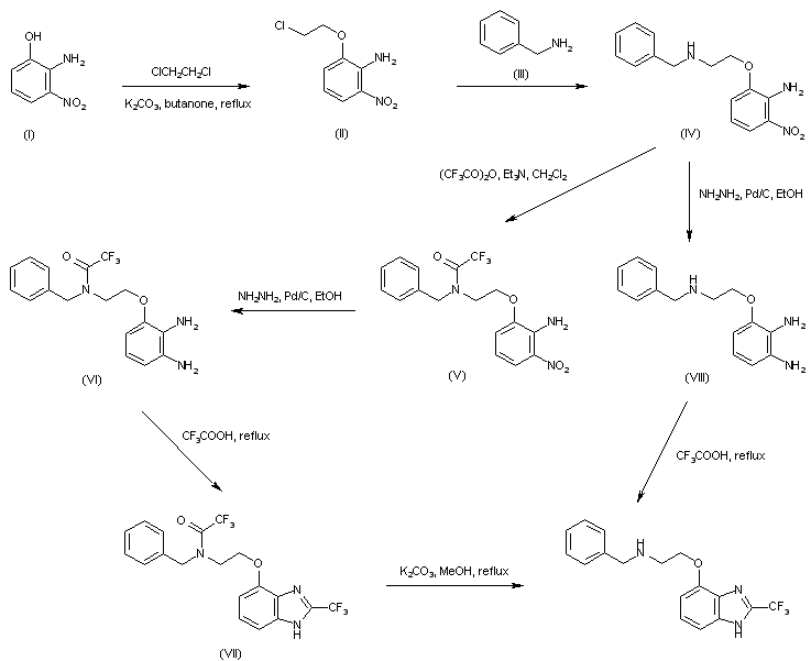 Alkylation of 2-amino-3-nitrophenol (I) with 1,2-dichloroethane in 2-butanone afforded the chloroethyl ether (II), which was further condensed with benzylamine (III) to give amine (IV) (1,2). Acylation of (IV) with trifluoroacetic anhydride provided trifluoroacetamide (V). The nitro group of (V) was then reduced by transfer hydrogenation using hydrazine and Pd/C. Cyclization of the resulting phenylenediamine (VI) in refluxing TFA gave rise to benzimidazole (VII). The trifluoroacetamido group of (VII) was finally removed by treatment with K2CO3 in boiling MeOH (1). In a more direct procedure, nitroaniline (IV) was reduced to diamine (VIII) and then cyclized to the title benzimidazole by treatment with TFA.