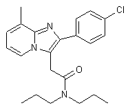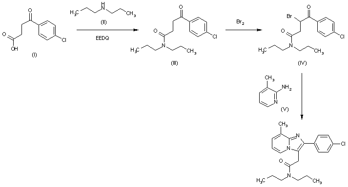 Condensation of carboxylic acid (I) with dipropylamine (II) in the presence of ethyl 1,2-dihydro-2-ethoxy-1-quinolinecarboxylate (EEDQ) yields amide (III), which is then brominated with Br2 in CCl4 to provide derivative (IV). Finally, bromoketoamide (IV) is cyclized with to 3-methyl-2-aminopyridine (V) in DMF to furnish the target product.