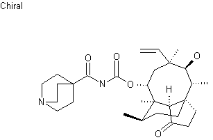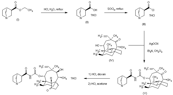 Ethyl (3R,4S)-1-azabicyclo[2.2.1]heptane-3-carboxylate (I) was hydrolyzed in boiling HCl, and the resulting acid (II) was further converted to acid chloride (III) by treatment with SOCl2. Condensation of acid chloride (III) with (3R)-3-deoxo-11-deoxy-3-methoxy-11-oxo-4-epimutilin (IV) in the presence of silver cyanate furnished the acylcarbamate ester (V). Acid-promoted rearrangement of (V) to the mutilin acylcarbamate then gave the title compound, which was isolated as the corresponding hydrochloride salt.