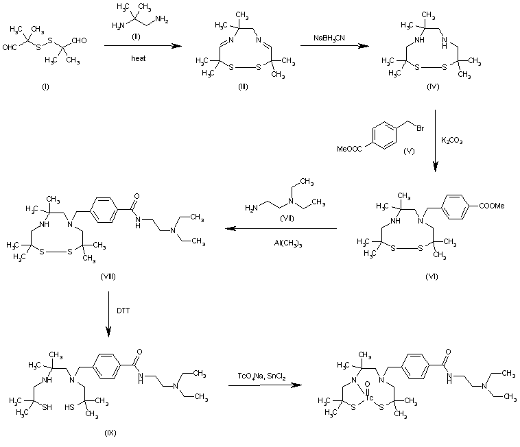 The cyclization of 2,2,5,5-tetramethyl-3,4-dithiahexane-1,6-dial (I) with 2-methylpropane-1,2-diamine (II) in hot ethanol gives 3,3,6,6,10,10-hexamethyl-1,2-dithia-5,8-diazacyclodeca-4,8-diene (III), which is reduced with NaBH3CN in ethanol to afford the corresponding cyclodecane compound (IV). The condensation of (IV) with 4-(bromomethyl)benzoic acid methyl ester (V) by means of K2CO3 in refluxing acetonitrile yields the adduct (VI), which is condensed with 2-(diethylamino)ethylamine (VII) by means of Al(CH3)3 in refluxing dichloromethane to provide the corresponding amide (VIII). Ring opening of (VIII) at the S-S bond by means of dithiothreitol (DTT) and TEA in methanol gives the dithiol (IX), which is finally treated with TcO4Na, PPh3 and N,S-dimethyldithiocarbazate (MDTCZ) in ethanol / 1M HCl.