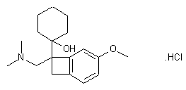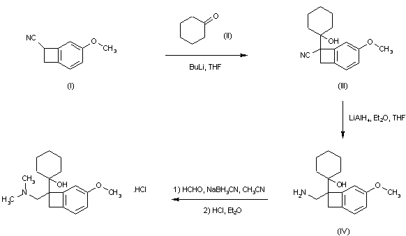 Lithiation of 1-cyano-5-methoxybenzocyclobutane (I), followed by addition of cyclohexanone (II), provided the 1-hydroxycyclohexyl adduct (III). The cyano group of (III) was then reduced to amine (IV) using LiAlH4. Reductive alkylation of amine (IV) with formaldehyde and NaBH3CN furnished the corresponding dimethylamino derivative, which was then converted to the corresponding hydrochloride salt with ethereal HCl.