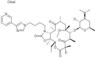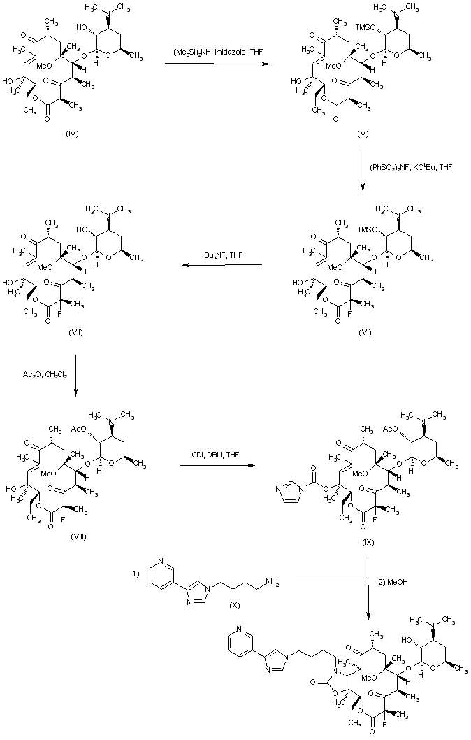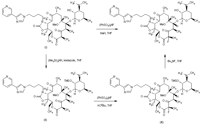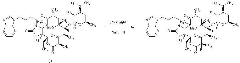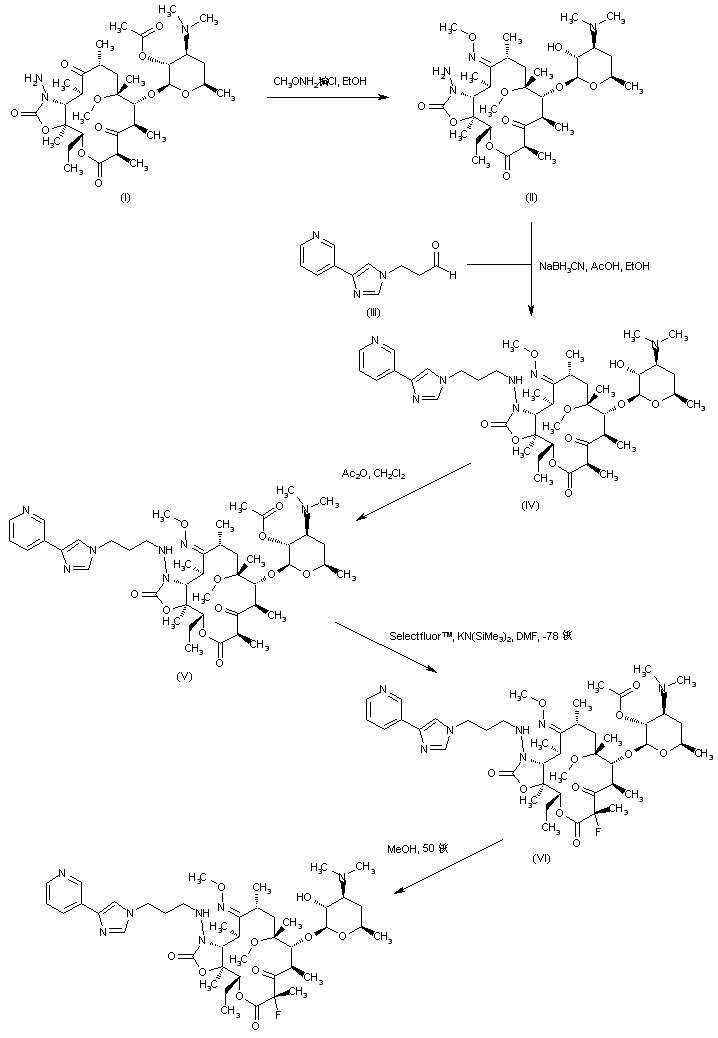 Treatment of macrolide (I) with O-methylhydroxylamine hydrochloride produced the 9-oxime (II) with concomitant deacetylation. Reductive condensation of (II) with pyridylimidazolylpropionaldehyde (III) in the presence of NaBH3CN gave adduct (IV), which was reprotected as the acetate ester (V). Fluorination of (V) at position 2 to afford fluorolactone (VI) was achieved by treatment of the corresponding potassium enolate with 1-(chloromethyl)-4-fluoro-1,4-diazoniabicyclo[2.2.2]octane bis(tetrafluoroborate) (Selectfluor(TM)). The title compound was finally obtained by deacetylation of (VI) in hot MeOH.