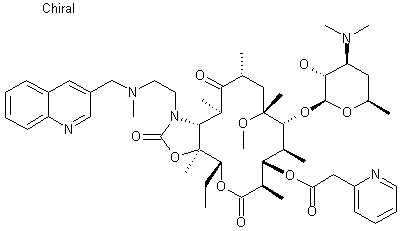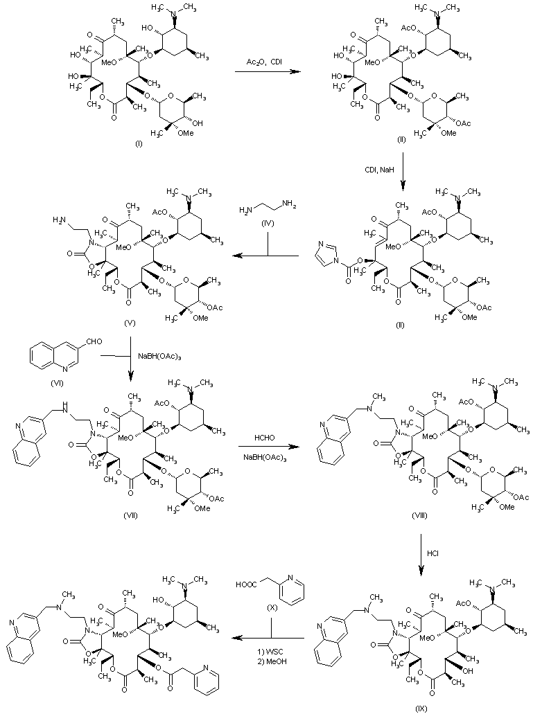 The acetylation of clarithromycin (I) with acetic anhydride gives the diacetate (II), which is acylated with CDI yielding the 12-O-(imidazolylcarbonyl) compound (III). The cyclization of (III) with ethylenediamine (IV) affords the cyclic carbamate (V), which is alkylated by reductocondensation with quinoline-3-carbaldehyde (VI) and NaBH(OAc)3 to give the secondary amine (VII). The methylation of this amine with formaldehyde and NaBH(OAc)3 yields the corresponding tertiary amine (VIII), which is treated with aqueous HCl to provide the descladinosyl compound (IX). Finally, this compound is acylated with 2-(2-pyridyl)acetic acid (X) by means of 1-[3-(dimethylamino)propyl]-3-ethylcarbodiimide (WSC) and deacetylated with methanol to afford the target compound.