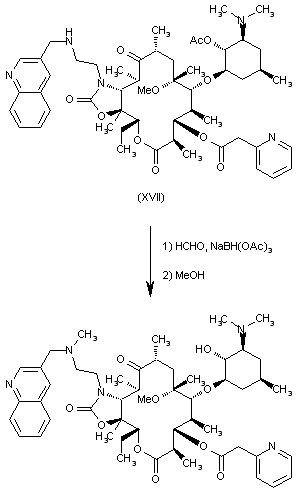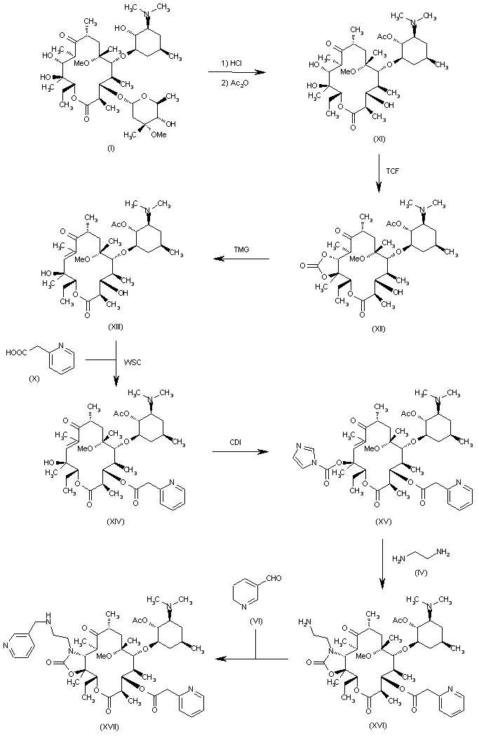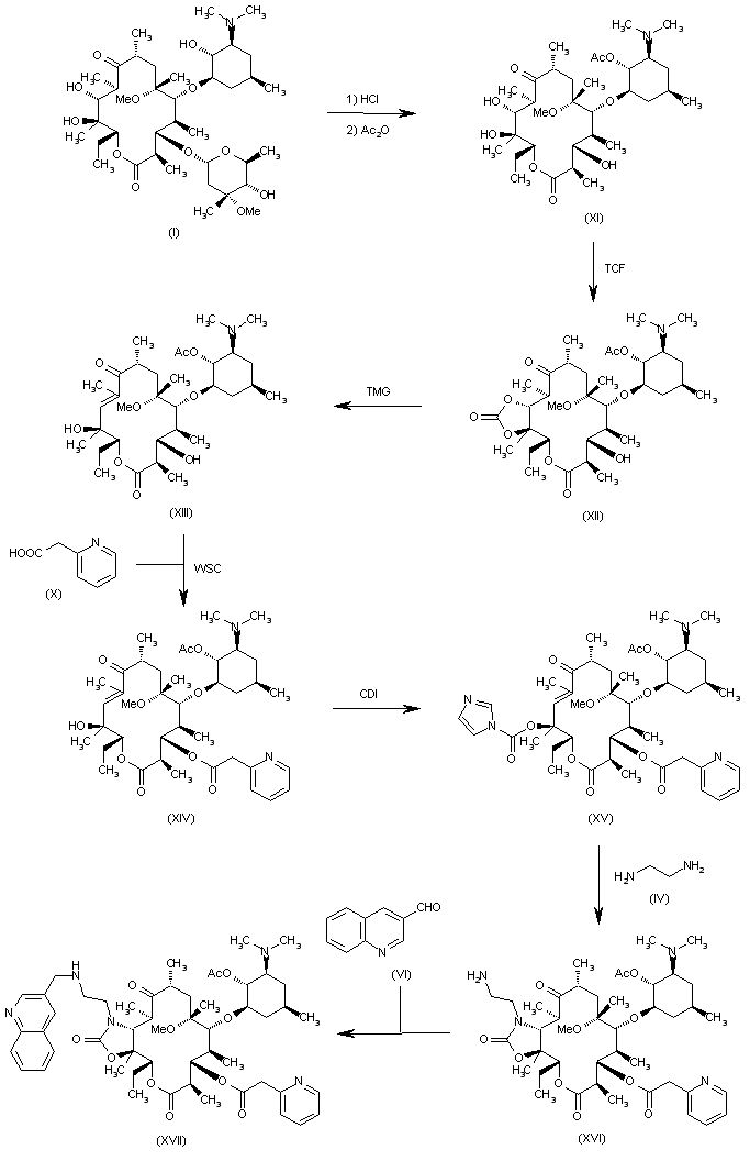The selective hydrolysis of clarithromycin (I) with aqueous HCl, followed by acylation with acetic anhydride gives the monoacetylated descladinosyl compound (XI), which by reaction with trichloromethyl chloroformate (TCF) yields the cyclic carbonate (XII). The reaction of (XII) with 1,1,3,3-tetramethylguanidine (TMG) affords intermediate (XIII), which is selectively acylated with 2-(2-pyridyl)acetic acid (X) and WSC giving the 3-O-acylated compound (XIV). The activation of (XIV) with CDI affords the 12-O-imidazolylcarbonyl derivative (XV), which is cyclized with ethylenediamine (IV) providing the carbamate (XVI). The alkylation of the primary amine of (XVI) by reductocondensation with quinoline-3-carbaldehyde (VI) and NaBH(OAc)3 gives the secondary amine (XVII).