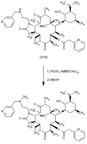 Finally, the secondary amine of (XVII) is methylated with formaldehyde and NaBH(OAc)3 and deacetylated with methanol to afford the target compound.