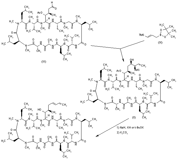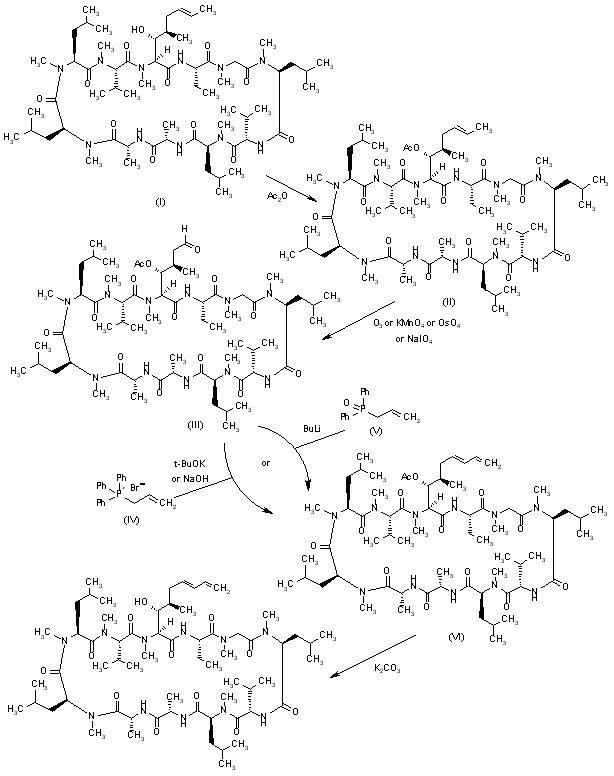 Acylation of ciclosporin (I) with Ac2O and DMAP gives the acetoxy ciclosporin derivative (II), which is oxidized with O3, KMnO4, OsO4 or NaIO4 in acetonitrile to yield the carbaldehyde (III). The Wittig condensation of aldehyde (III) with either allyltriphenylphosphonium bromide (IV) by means of t-BuOK in THF or NaOH in toluene (1-3) or allyldiphenylphosphine oxide (V) by means of butyl lithium in THF (1, 3) provides the (E)-diene derivative (VI), which is finally deacylated by means of K2CO3 in methanol (1-3).