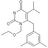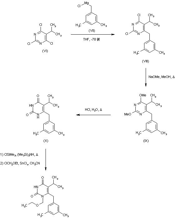 In an alternative procedure, condensation of 5-isopropyl-2,4,6-trichloropyrimidine (VI) with 3,5-dimethylbenzylmagnesium chloride (VII) in cold THF produced the 6-benzyl pyrimidine derivative (VIII). Subsequent reaction of (VIII) with sodium methoxide gave dimethoxypyrimidine (IX), which was hydrolyzed to uracil (X) with concentrated HCl. After silylation of (X) with chlorotrimethylsilane and hexamethyldisilazane, alkylation with chloromethyl ethyl ether in the presence of SnCl4 furnished the title compound.