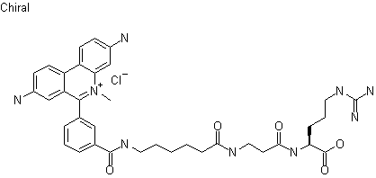 Acylation of amino derivative (I) with 3-cyanobenzoyl chloride (II) provides amide (III) which is then cyclized to give phenanthridine (IV) by refluxing with phosphoryl chloride in nitrobenzene and catalysis of SnCl4. Hydrolysis of the nitrile derivative (IV) in H2SO4 gives carboxylic acid derivative (V). Quaternization of (V) is carried out using dimethyl sulfate and after refluxing in a HCl solution, derivative (VI) is obtained. Reduction of (VI) using iron powder in a mixture of HCl-ethanol yields the ethidium chloride derivative (VII) which is coupled to the protected arginine-linking chain (VIII) (see below) in presence of DCC and HOBt. Last step is the deprotection of the arginine moiety with TFA and separation of the obtained products.
