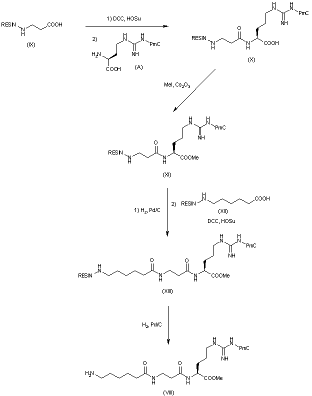 Derivative (VIII) is obtained as follows: Activation of protected aminoacid (IX) with DCC/HOSu and coupling with H-Arg(Pmc)-OH (A) yields carboxylic acid derivative (X) which is converted to methyl ester (XI). Catalytic hydrogenation of (XI) and coupling with the protected caproic acid (XII) in presence of DCC and HOSu provides derivative (XIII) which is finally catalytically hydrogenated yielding intermediate (VIII).
