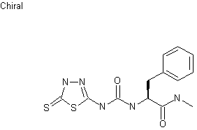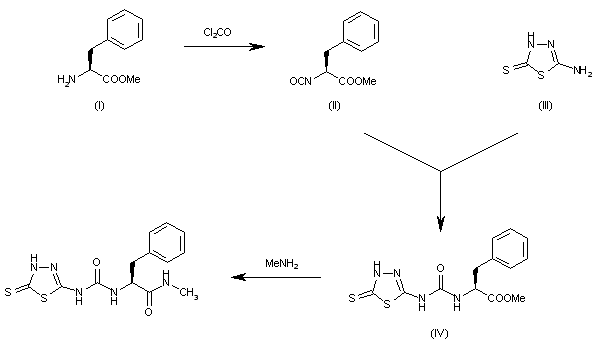 The reaction of L-phenylalanine methyl ester (I) with phosgene and pyridine in dichloromethane gives the isocyanate (II) (1), which is condensed with 5-amino-1,3,4-thiadiazol-2(3H)-thione (III) in THF to yield the urea (IV). Finally, this compound is treated with methylamine in ethanol to affords the target compound.