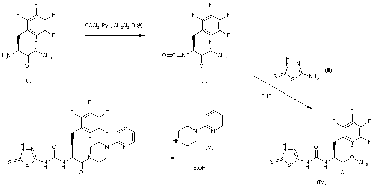 Pentafluorophenylalanine methyl ester (I) was treated with phosgene and pyridine to afford isocyanate (II), which was condensed with 5-aminothiadiazole-2-thione (III) to provide urea (IV). Then, displacement of the ester function of (IV) with 1-(2-pyridyl)piperazine (V) furnished the title amide.