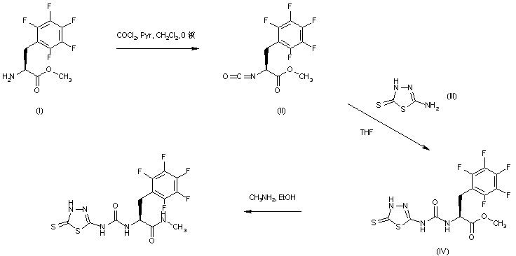 Pentafluorophenylalanine methyl ester (I) was treated with phosgene and pyridine to afford isocyanate (II), which was condensed with 5-aminothiadiazole-2-thione (III) to provide urea (IV). Then, displacement of the ester function of (IV) with methylamine furnished the title amide.