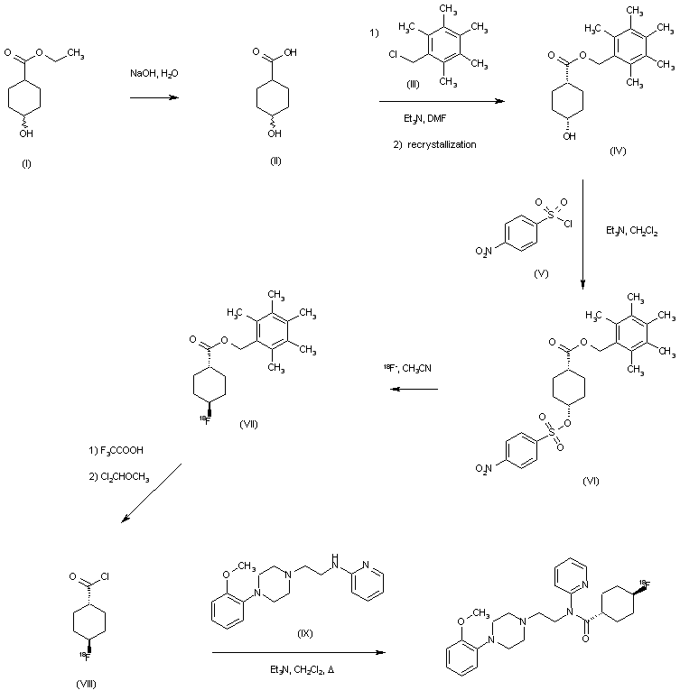 A mixture of cis and trans 4-hydroxycyclohexanecarboxylic acids (II), obtained by basic hydrolysis of the corresponding ethyl ester (I), was alkylated with pentamethylbenzyl chloride (III) in the presence of Et3N to afford pentamethylbenzyl ester (IV). Recrystallization from methylene chloride/hexane provided pure cis isomer, which was converted to 4-nitrobenzenesulfonate (VI) with p-nitrobenzenesulfonyl chloride (V) and Et3N. Subsequent displacement of the sulfonate group of (VI) for a 18F- provided the labeled intermediate (VII). Then, cleavage of the benzyl ester of (VII) with trifluoroacetic acid, followed by treatment with dichloromethyl methyl ether gave trans 4-18fluorocyclohexanecarbonyl chloride (VIII). This was finally coupled with amine (WAY-100634)(IX) in the presence of Et3N in CH2Cl2 to produce the target amide.