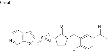 The reaction of 5-chlorothieno[3,2-b]pyridine (XI) with n-BuLi and SO2 in THF and further oxidation with SO2Cl2 gives sulfonyl chloride (XII), which was coupled with aminopyrrolidinone (X) by means of TEA in dichloromethane to yield sulfonamide (XIII). Conversion of the nitrile of (XIII) to the corresponding imidate with HCl in methanol, followed by reaction with ammonia produced benzamidine (XIV). Finally, hydrogenolytic dechlorination of (XIV) over Pd/C provided the title compound.