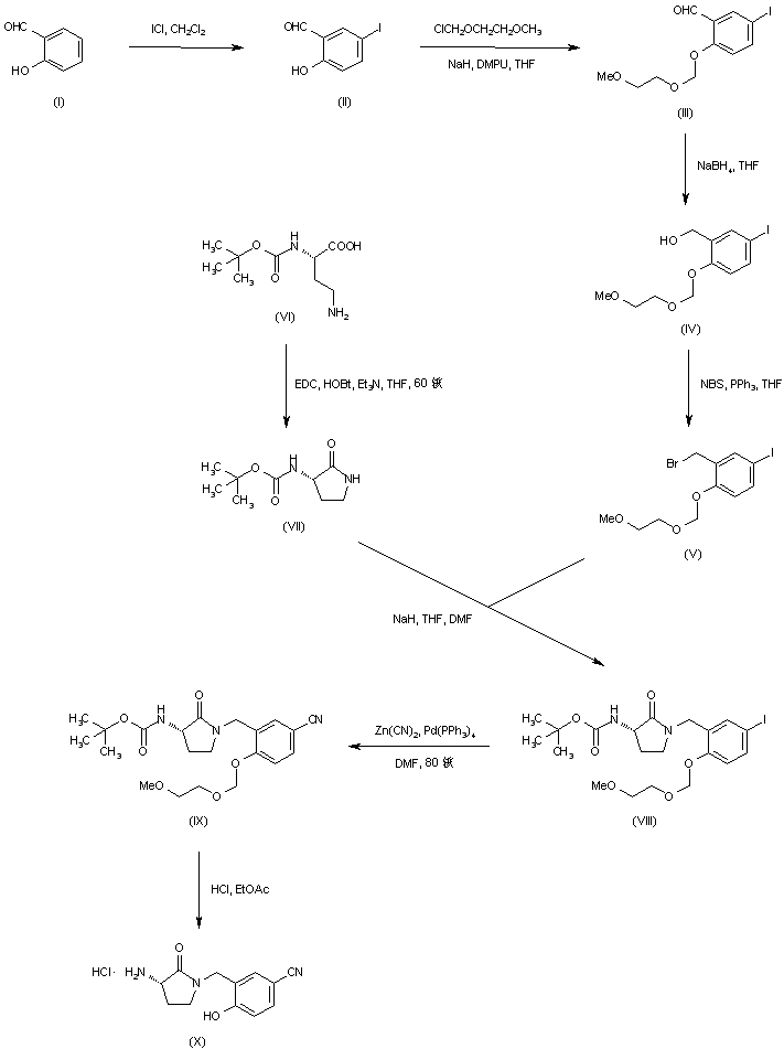 Reaction of salicylaldehyde (I) with iodine monochloride produced 2-hydroxy-5-iodobenzaldehyde (II), which was protected with (2-methoxyethoxy) methyl chloride to give ether (III). Reduction of the aldehyde group of (III) with NaBH4 yielded alcohol (IV) and subsequent treatment with N-bromosuccinimide and triphenylphosphine generated bromide (V). N-Boc-3-aminopyrrolidinone (VII) was prepared by cyclization of (S)-alpha-Boc-2,4-diaminobutyric acid (VI) in the presence of EDC and HOBt. Subsequent alkylation of (VII) with bromide (V) produced the N-benzylpyrrolidinone derivative (VIII). Displacement of iodide group of (VIII) by zinc cyanide gave nitrile (IX). Then, acid cleavage of both Boc and MEM protecting groups furnished intermediate (X).