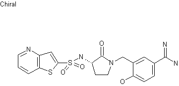 The reaction of 5-chlorothieno[3,2-b]pyridine (XI) with n-BuLi and SO2 in THF and further oxidation with SO2Cl2 gives sulfonyl chloride (XII), which was coupled with aminopyrrolidinone (X) by means of TEA in dichloromethane to yield sulfonamide (XIII). Conversion of the nitrile of (XIII) to the corresponding imidate with HCl in methanol, followed by reaction with ammonia produced benzamidine (XIV). Finally, hydrogenolytic dechlorination of (XIV) over Pd/C provided the title compound.