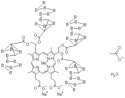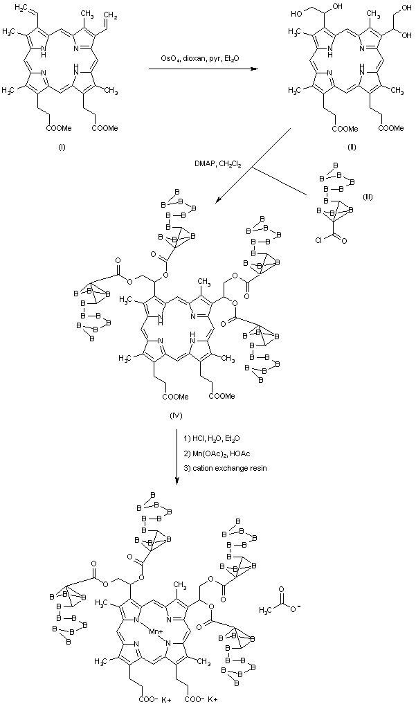 Hydroxylation of protoporphyrin dimethyl ester (I) by means of osmium tetroxide afforded the bis(glycol) derivative (II). This was condensed with carborane carbonyl chloride (III) in the presence of dimethylaminopyridine to provide tetraester (IV). Acid hydrolysis of the methyl ester groups, followed by complexation with manganese diacetate and passage through an ion exchange resin furnished the title compound.