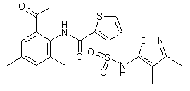 | 合成路线图解说明: Coupling between 2-(methoxycarbonyl)-3-thiophenesulfonyl chloride (I) and 5-amino-3,4-dimethylisoxazole (II) afforded the corresponding sulfonamide (III). The sulfonamide NH group of (III) was then protected by reaction with bromomethyl methyl ether to produce the methoxymethyl derivative (IV). Basic hydrolysis of the methyl ester function of (IV), followed by treatment of the resultant carboxylic acid (V) with oxalyl chloride, furnished the acid chloride (VI). This was then coupled with 2'-amino-3',5'-dimethylacetophenone (VII) to yield amide (VIII). The methoxymethyl protecting group of (VIII) was finally removed by acidic treatment to provide the title compound. |