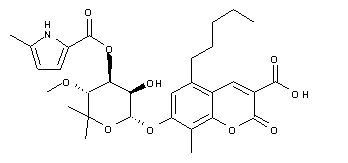 Wittig olefination of 3,5-dimethoxy-4-methylbenzaldehyde (I) with butylidene triphenylphosphorane produced a Z/E mixture of olefins (II), which was hydrogenated over Pd/C to afford the n-pentyl derivative (III). Cleavage of the methyl ethers of (III) using iodotrimethylsilane provided diol (IV). Introduction of the aldehyde group in (IV) was achieved by Gattermann formylation with zinc cyanide and HCl. The target coumarin (VI) was prepared by Pechmann condensation of hydroxy aldehyde (V) with dibenzyl malonate. Glycosylation of (VI) with the noviose intermediate (VII) under Mitsunobu conditions produced the alpha-glycoside (VIII) as the major isomer. The free carboxylic acid was then obtained by catalytic hydrogenolysis of the benzyl ester (VIII).