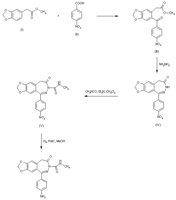 Benzophenone (III) was prepared by Friedel-Crafts acylation of methyl 3,4-methylenedioxyphenylacetate (I) with 4-nitrobenzoic acid (II). Subsequent cyclization of (III) with hydrazine gave rise to benzodiazepinone (IV). This was treated with methyl isocyanate in the presence of triethylamine to yield the corresponding urea (V). Finally, the nitro group of (V) was reduced to the title aniline by catalytic hydrogenation using Pd-C.