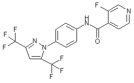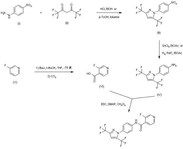 Acid-catalyzed condensation of 4-nitrophenylhydrazine (I) with 1,1,1,5,5,5-hexafluoro-2,4-pentanedione (II) produced pyrazole (III). Reduction of the nitro group of (III) to the corresponding amine (IV) was achieved either by treatment with stannous chloride or by catalytic hydrogenation over Pd/C. Fluoroisonicotinic acid (VI) was prepared by lithiation of 3-fluoropyridine (V) at -78 C followed by quenching with dry ice. Finally, coupling of acid (VI) with amine (IV) yielded the target amide.