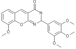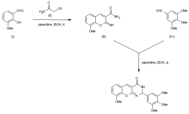 Condensation of 3-methoxysalicylaldehyde (I) with cyanoacetamide (II) in the presence of piperidine gave rise to the carbamoyl iminochromene (III). Subsequent condensation of (III) with 3,4,5-trimethoxybenzaldehyde furnished the title compound.