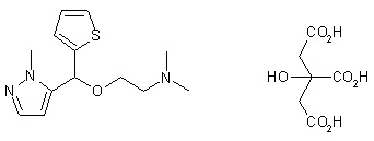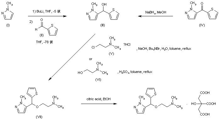 Lithiation of N-methylpyrazole (I) by means of n-butyllithium, followed by addition to 2-thiophenecarboxaldehyde (II), afforded carbinol (III). This compound was alternatively obtained by sodium borohydride reduction of diheteroaryl ketone (IV). Condensation of alcohol (III) with either 2-(dimethylamino)ethyl chloride (IV) in the presence of NaOH or 2-(dimethylamino)ethanol (VI) under catalysis of H2SO4 furnished ether (VII). This compound was finally converted to the title citrate salt by treatment with citric acid in EtOH.