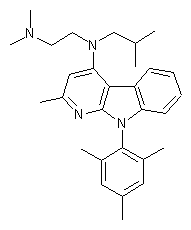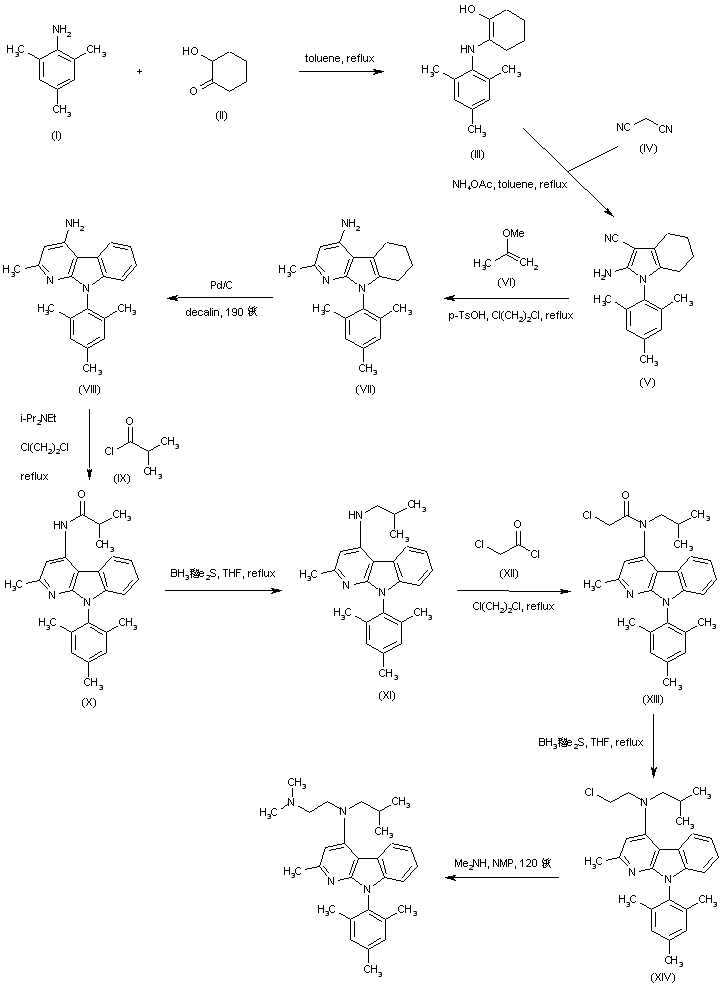 | 合成路线图解说明: The condensation of 2,4,6-trimethylaniline (I) with adipoin (II) in hot toluene, followed by reaction of the resulting intermediate (III) with malononitrile (IV), gave rise to the tetrahydroindole (V). Subsequent condensation of amino nitrile (V) with 2-methoxypropene (VI) produced the tetrahydropyrido[2,3-b]indole system (VII), which was dehydrogenated to (VIII) by means of Pd/C in boiling decalin. Acylation of (VIII) with isobutyryl chloride (IX) afforded amide (X), which was reduced to amine (XI) employing borane-dimethyl sulfide complex. Further acylation with chloroacetyl chloride (XII), and then reduction of the resulting chloroacetamide (XIII) with borane-dimethyl sulfide, provided the chloroethyl amine (XIV). This was finally treated with dimethylamine in hot N-methylpyrrolidinone in a steel bomb to furnish the desired dimethylamino compound. |