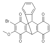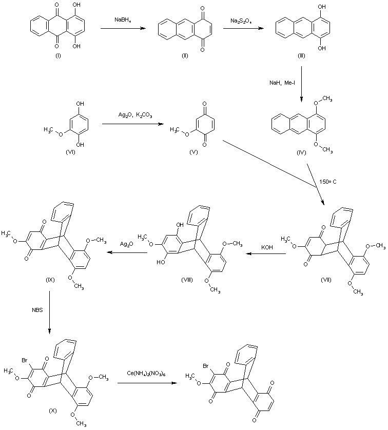The reduction of 1,4-dihydroxy-9,10-anthraquinone (I) with NaBH4 in methanol gives 1,4-anthraquinone (II), which is reduced with Na2S2O4 in dioxane/water to yield 1,4-anthracenediol (III). The methylation of (III) with NaH and Me-I in DMF affords 1,4-dimethoxyanthracene (IV), which is condensed with 2-methoxy-1,4-benzoquinone (V) (obtained by oxidation of 2-methoxyhydroquinone (VI) with Ag2O and K2CO3 in benzene) by heating at 150 C with toluene in a sealed tube to provide the triptycene derivative (VII). The reaction of (VII) with KOH in dioxane/water gives the triptycenediol (VIII), which is oxidized with Ag2O in refluxing acetone to yield the triptycenequinone (IX). The bromination of (IX) with NBS in hot DMF affords the bromo derivative (X), which is finally oxidized with Ce(NH4)2(NO3)6 to afford the target triptycenediquinone.