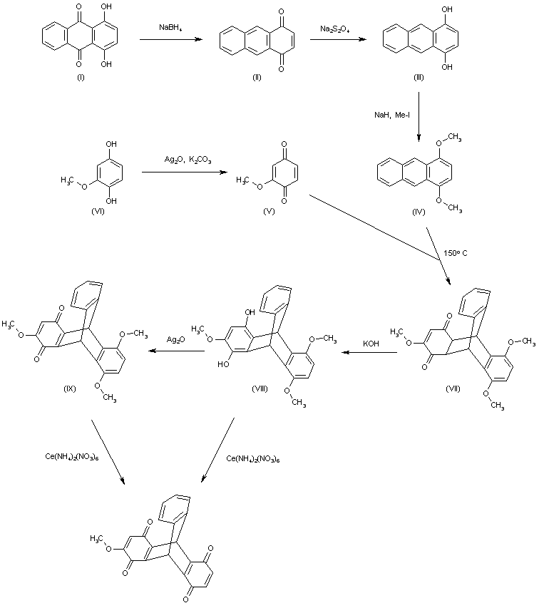 The reduction of 1,4-dihydroxy-9,10-anthraquinone (I) with NaBH4 in methanol gives 1,4-anthraquinone (II), which is reduced with Na2S2O4 in dioxane/water to yield 1,4-anthracenediol (III). The methylation of (III) with NaH and Me-I in DMF affords 1,4-dimethoxyanthracene (IV), which is condensed with 2-methoxy-1,4-benzoquinone (V) (obtained by oxidation of 2-methoxyhydroquinone (VI) with Ag2O and K2CO3 in benzene) by heating at 150 C with toluene in a sealed tube to provide the triptycene derivative (VII). The reaction of (VII) with KOH in dioxane/water gives the triptycenediol (VIII), which is oxidized with Ag2O in refluxing acetone to yield the triptycenequinone (IX). Finally, this compound is oxidized with Ce(NH4)2(NO3)6 to afford the target triptycenediquinone.