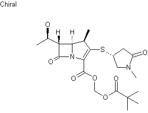 1) The mesylation of 4(S)-hydroxypyrrolidin-2-one (I) with mesyl chloride and triethylamine in pyridine gives the corresponding ester (II), which is treated with potassium thioacetate (III) in refluxing acetonitrile yielding 4(R)-(acetylsulfanyl)pyrrolidin-2-one (IV). The hydrolysis of (IV) with sodium methoxide in methanol followed by acidification with aqueous HCl affords 4(R)-sulfanylpyrrolidin-2-one (V), which is condensed with (1R,5S,6S)-2-(diphenoxyphosphoryloxy)-6-[1(R)-hydroxyethyl]-1-methyl-1-carba-2-penem-3-carboxylic acid p-nitrobenzyl ester (VI) by means of ethyldiisopropylamine in acetonitrile to give (1R,5S,6S)-6-[1(R)-hydroxyethyl]-1-methyl-2-[5-oxopyrrolidin-3(R)-ylsulfanyl]-1-carba-2-penem-3-carboxylic acid p-nitrobenzyl ester (VII). The hydrogenolysis of (VII) with H2 over Pd/C in THF/aqueous phosphate buffer yields the sodium salt (VIII), which is finally esterified with pivaloyloxymethyl iodide (IX) in dimethylacetamide.