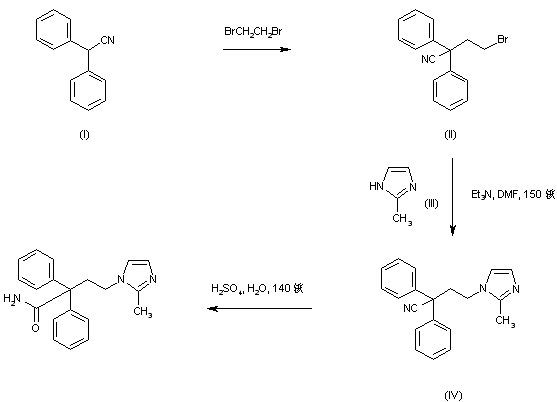 Alkylation of diphenylacetonitrile (I) with dibromoethane provided bromide (II). This was condensed with 2-methylimidazole (III) in the presence of Et3N in DMF to afford the substituted imidazole (IV). Finally, hydrolysis of the cyano group of (IV) with 70% sulfuric acid produced the target amide.