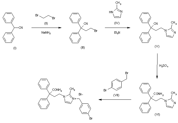 Treatment of acetonitrile derivative (I) with dibromoethane (II) in toluene in the presence of NaNH2 affords bromo compound (III), which is then condensed with imidazole derivative (IV) by means of Et3N in DMF to provide compound (V). Hydrolysis of the cyano group of (V) with aqueous H2SO4 yields amide derivative (VI), which is finally subjected to alkyl quaternization by reaction with bromobenzyl bromide (VI) in acetone to furnish the desired product.