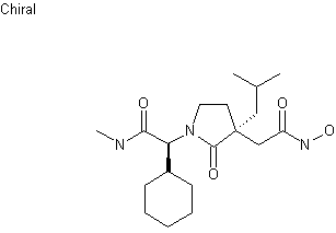 2-Pyrrolidinone (I) was protected as the N-Boc derivative (II) and then alkylated with 3-bromo-2-methylpropene (III) in the presence of LDA to yield (IV). Further alkylation of (IV) with tert-butyl bromoacetate gave the dialkylated pyrrolidinone (V). Catalytic hydrogenation of the 2-methylpropenyl substituent of (V) produced the racemic isobutyl analogue (VI), which was resolved by means of chiral HPLC. The desired (S)-enantiomer (VII) was deprotected by treatment with magnesium ethoxide, affording pyrrolidinone (VIII). N-Alkylation of the pyrrolidinone (VIII) with triflate (IX) furnished adduct (X), which was hydrolyzed to carboxylic acid (XI) with methanolic NaOH. After activation of (XI) with carbonyl diimidazole, coupling with methylamine gave rise to amide (XII). Cleavage of the tert-butyl ester group of (XII) employing trifluoroacetic acid produced carboxylic acid (XIII). This was finally coupled with hydroxylamine using EDC and HOBt.