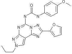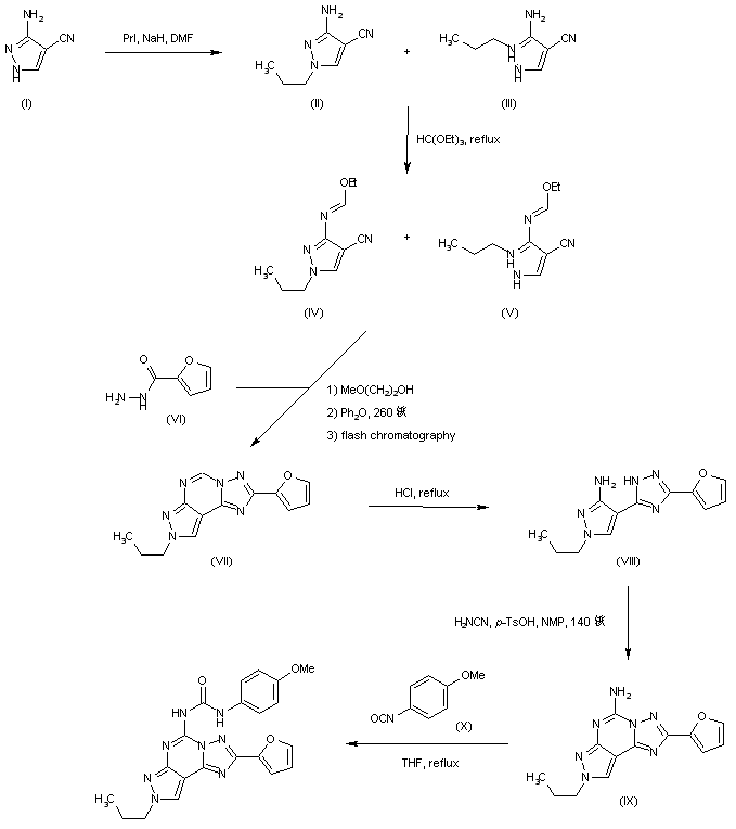 The alkylation of 5-amino-4-cyanopyrazole (I) with n-propyl iodide led to a 4:1 inseparable mixture of regioisomers (II) and (III). This mixture was transformed into the respective imidates (IV) and (V) through refluxing in triethyl orhoformate. Subsequent addition of 2-furoic hydrazide (VI) to the nitrile group of (IV)+(V), followed by thermal cyclization in diphenyl ether at 260 C furnished the corresponding pyrazolotriazolopyrimidines. The desired regioisomer (VII) was then isolated by flash chromatography. Hydrolysis of (VII) with aqueous HCl afforded the aminopyrazole (VIII), which was further converted to the tricyclic compound (IX) by reaction with cyanamide and p-toluenesulfonic acid. Finally, coupling of (IX) with p-methoxyphenyl isocyanate (X) provided the title urea.