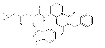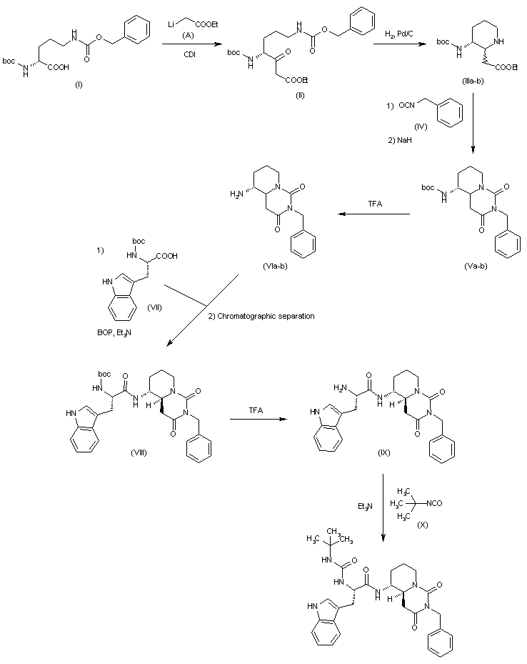 Condensation of Boc-D-Orn(COOCH2Ph)-OH (I) with the lithium salt of ethyl acetate (A) in the presence of CDI in THF affords derivative (II), which is then hydrogenated over Pd/C to yield the mixture of isomers (IIIa-b). Condensation of (IIIa-b) with benzyl isocyanate in THF, followed by simultaneous reduction and cyclization by means of NaH in THF, provides 1,3-dioxoperhydropyrido[1,2-c]pyrimidine (Va-b), whose N-Boc group is removed by treatment with TFA in CH2Cl2 to furnish amine (VI). Coupling of (VIa-b) to Boc-L-Trp-OH (VII) by means of BOP and Et3N in CH2Cl2, followed by chromatographic separation, gives derivative (VIII), which is subjected to Boc removal by treatment with TFA in CH2Cl2 to provide amine (IX). Finally, amine (IX) is condensed with t-butyl isocyanate in the presence of Et3N in THF to yield the target compound.
