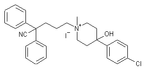 Diphenylacetonitrile (I) was alkylated with 1,3-dibromopropane (II) in the presence of NaH in DMF to afford the bromopropyl derivative (III). Subsequent condensation of bromide (III) with 4-(4-chlorophenyl)-4-hydroxypiperidine (IV) gave the tertiary amine (V). This was then quaternized with methyl iodide to furnish the corresponding piperidinium salt.