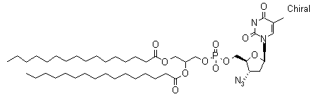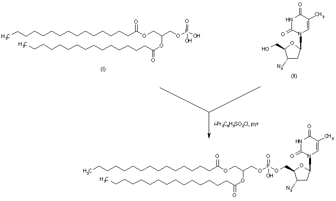 The synthesis of the title compound has been reported by two procedures. Coupling of dipalmitoylphosphatidic acid (I) to 3'-azido-3'-deoxythimidine (AZT) (II) was carried out using triisopropylbenzenesulfonyl chloride in pyridine to provide the target phosphate diester.