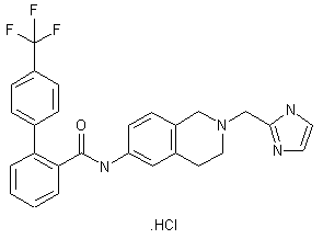 4-Bromophenethyl amine (I) was refluxed with ethyl formate to afford formamide (II). Cyclization of (II) employing polyphosphoric acid and phosphorus pentoxide at 200 C furnished 7-bromo-3,4-dihydroisoquinoline, which was isolated as the corresponding hydrochloride salt (III). Reduction of (III) with NaBH4 gave the tetrahydroisoquinoline (IV), that was nitrated with KNO3 and H2SO4 to provide (V). After protection of (V) as the N-Boc derivative (VI), reduction of the nitro group with concomitant hydrogenolysis of the bromine by hydrogenation over Pd/CaCO3 yielded aminoisoquinoline (VII). This was coupled with 4?(trifluoromethyl)biphenyl-2-carboxylic acid (VIII) by means of EDC to produce amide (IX). Cleavage of the Boc group of (IX) with trifluoroacetic acid gave amine (X). Finally, reductive alkylation of (X) with imidazole-2-carbaldehyde (XI) and sodium cyanoborohydride furnished the title compound.