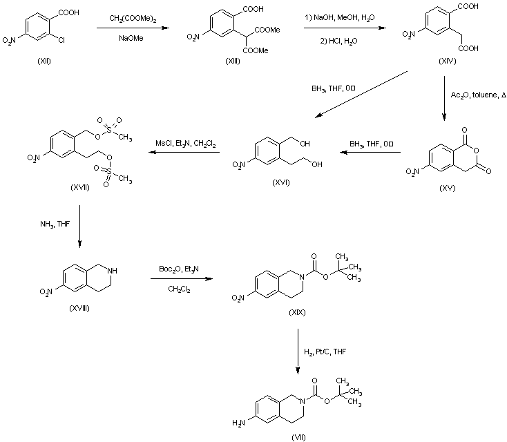 Condensation of 2-chloro-4-nitrobenzoic acid (XII) with dimethyl malonate produced the arylmalonate (XIII). Hydrolysis and subsequent decarboxylation of (XIII) afforded diacid (XIV). This was converted into cyclic anhydride (XV) upon refluxing with Ac2O and then reduced to diol (XVI) with borane in THF. Optionally, diol (XVI) was obtained by direct reduction of diacid (XIV) with borane. After conversion of (XVI) to dimesylate (XVII), cyclization with ammonia produced tetrahydroisoquinoline (XVIII). This was protected as the N-Boc derivative (XIX) and the nitro group was reduced to the target amine (VII) by hydrogenation over Pt/C .