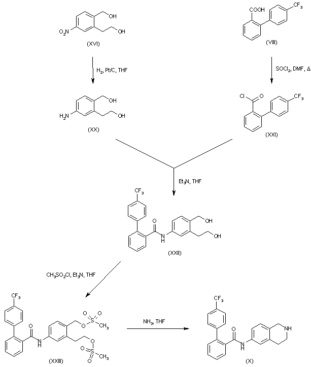 In a further procedure, nitro diol (XVI) was hydrogenated over Pt/C, and the resulting amine (XX) was condensed with acid chloride (XXI) (prepared from carboxylic acid (VIII) and SOCl2) to afford amide (XXII). After conversion of (XXII) to dimesylate (XXIII), cyclization with ammonia furnished intermediate (X).