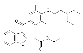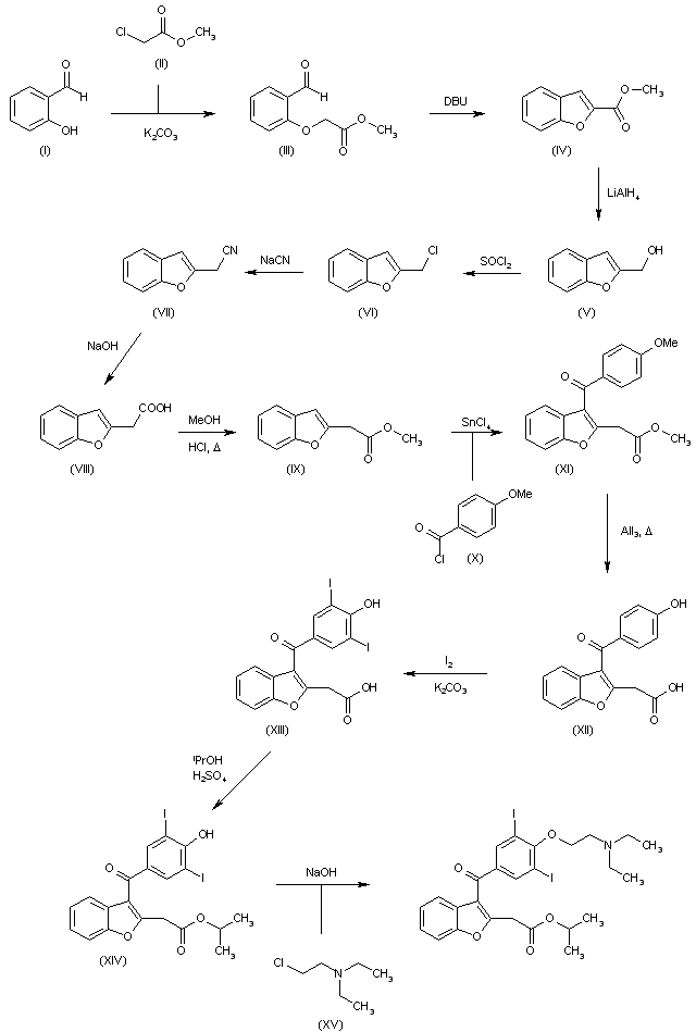 Treatment of salicylaldehyde (I) with methyl chloroacetate (II) in DMF in the presence of potassium carbonate provides methyl o-formylphenoxyacetate (III), which is converted into methyl 2-benzofuranecarboxylate (IV) by reaction with DBU in toluene. Reduction of (IV) by means of LiAlH4 in ether yields hydroxy derivative (V), which then reacts with SOCl2 in ether/DMF to furnish chloro derivative (VI). Treatment of (VI) with NaCN in DMSO affords cyano derivative (VII), which is converted into 2-benzofuraneacetic acid (VIII) by treatment with NaOH in boiling water. Esterification of (VIII) by treatment with HCl in refluxing MeOH affords methyl acetate derivative (IX), which is condensed with p-anisoyl chloride (X) by means of SnCl4 in 1,2-dichloroethane to yield compound (XI). Treatment of (XI) with aluminum powder and iodine crystals (to generate AlI3) in refluxing benzene gives acetic acid derivative (XII), which is iodinated with iodine and K2CO3 in H2O to give derivative (XIII). Esterification of (XIII) by means of iPrOH and H2SO4 provides isopropyl acetate derivative (XIV), which is finally converted into the desired product by reaction with diethylaminoethyl chloride (XV) in NaOH and CH2Cl2 in the presence of benzyltriethylammonium chloride.