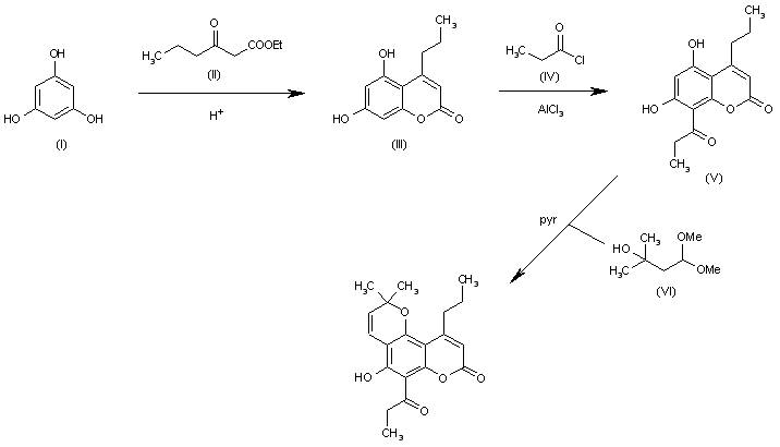 | 合成路线图解说明: The cyclization of floroglucinol (I) with ethyl 2-oxohexanoate (II) in acidic medium gives 5,7-dihydroxy-4-propyl-2H-1-benzopyran-2-one (III), which is submitted to a Friedel Crafts condensation with propionyl chloride (IV) / AlCl3 to yield the 8-propionyl derivative (V). Finally, the cyclization of (V) with 3-hydroxy-3-methylbutyraldehyde dimethyl acetal (VI) in refluxing pyridine affords the target compound. |