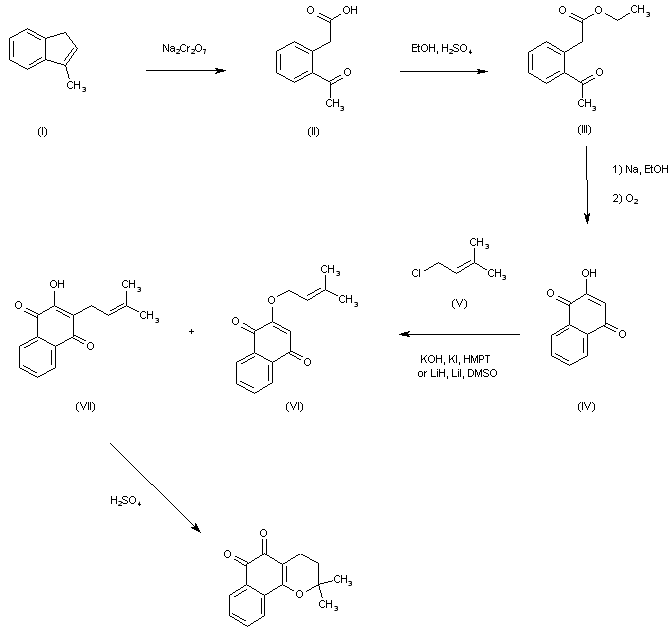 Oxidative cleavage of methylindene (I) by means of Na2Cr2O7 produces 2-acetylphenylacetic acid (II). Fischer esterification of keto acid (II) gives keto ester (III), which is subjected to intramolecular Claisen condensation and air oxidation, yielding the hydroxy naphthoquinone (IV) (1). Alkylation of (IV) with prenyl bromide (V) leads to a mixture of lapachol (VII) and minor amounts of the prenyl ether isomer (VI) (1-3). Finally, cyclization of (VII) in concentrated H2SO4 gives rise to the target compound.