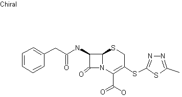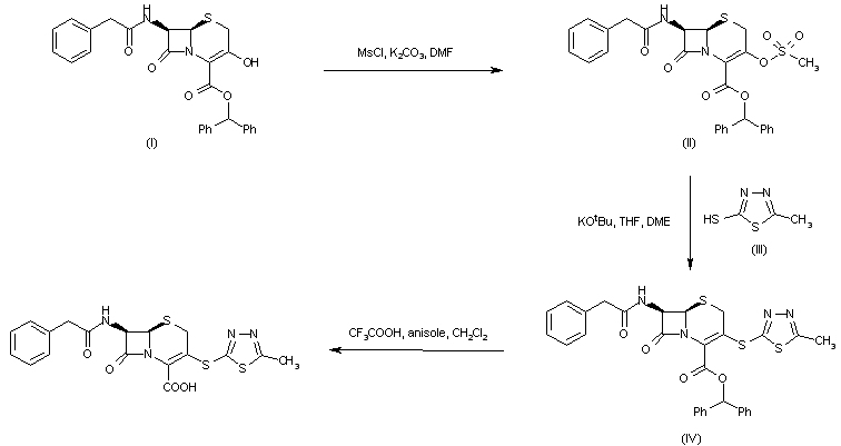 The title compound has been prepared by two related procedures: Treatment of 3-hydroxy cephem derivative (I) with methanesulfonyl chloride and K2CO3 afforded mesylate (II), which was condensed with 2-mercapto-5-methyl-1,3,4-thiadiazole (III) in the presence of potassium tert-butoxide to give thioether (IV). The benzhydryl ester of (IV) was then deprotected by treatment with trifluoroacetic acid.
